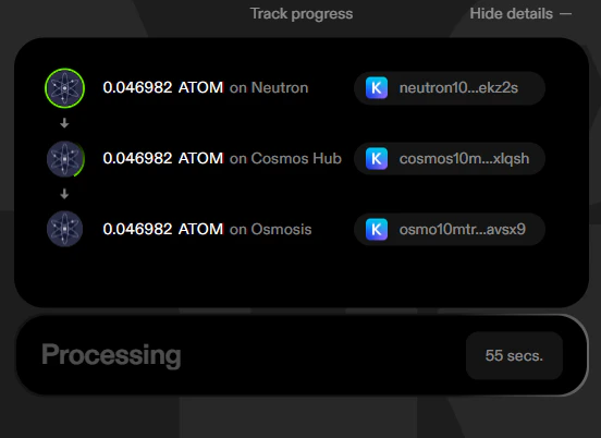 • Transactions and block explorer links for all of the significant events in the transfer (send tx, receive tx, and sometimes acknowledge tx)